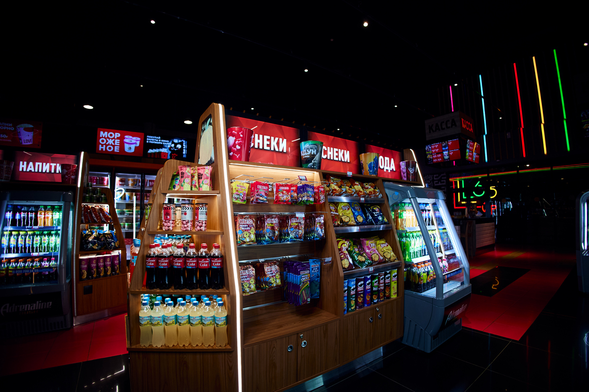 В кинотеатре работает бар, где можно заказать напитки, снеки и попкорн, чтобы просмотр любимого фильма не был омрачён внезапным чувством голода.